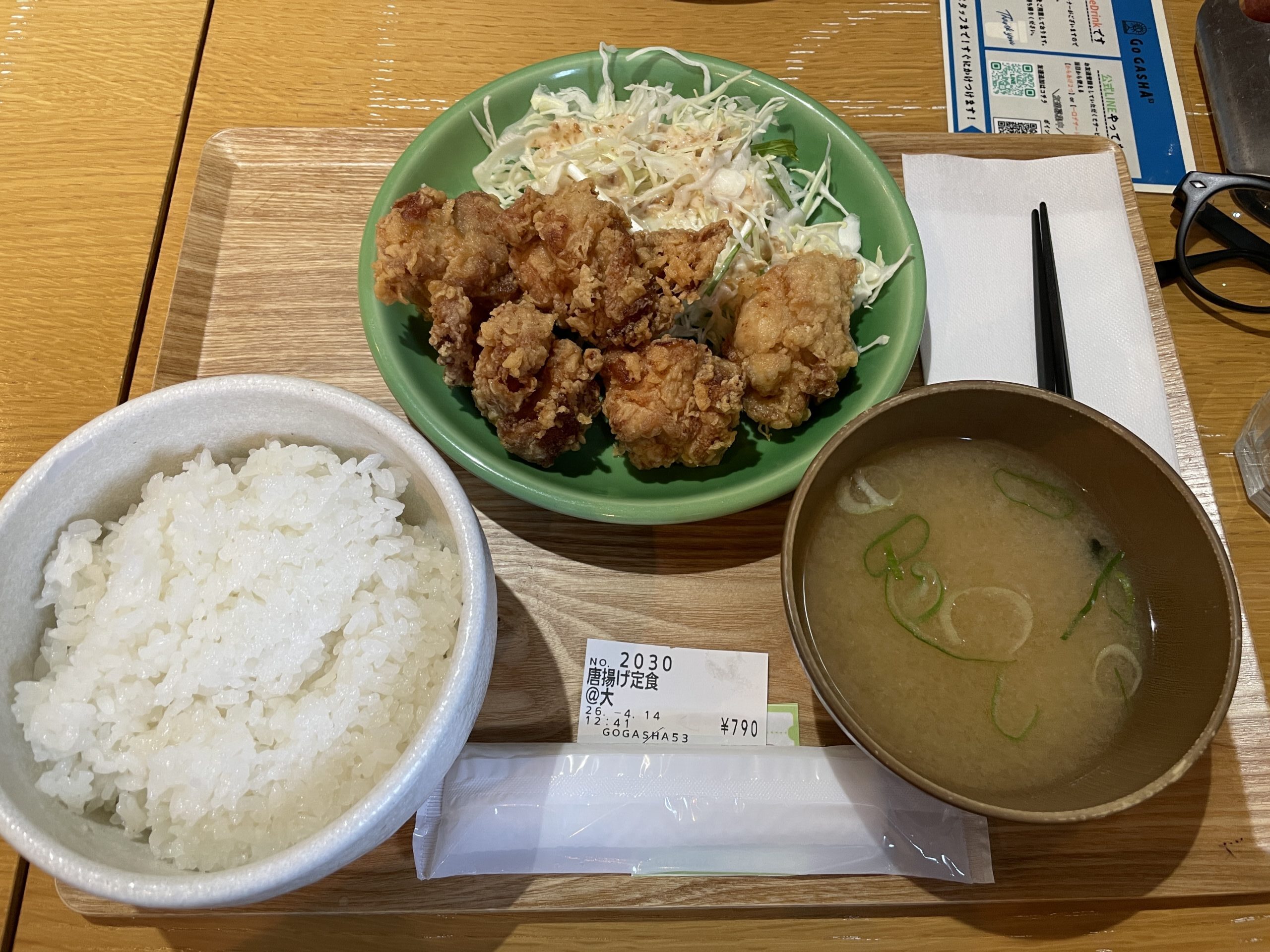 ランチには会社近くのお店で、から揚げ定食をいただきました。味噌汁とごはんがおかわり自由で、とても満足感がありました。つい食べ過ぎてしまい、午後は少し眠気と戦うことになりました。